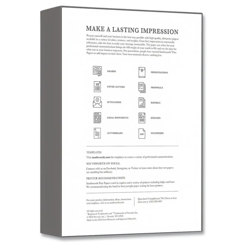 Create professional documents with this Southworth Parchment Specialty Paper. The parchment finish produces a sophisticated appearance, while the 24-pound material delivers a high-quality feel. This 1″ parchment specialty paper offer is acid-free and lignin-free, so ink won’t life off printed pages, allowing for documents to be archived.