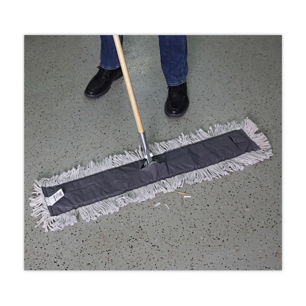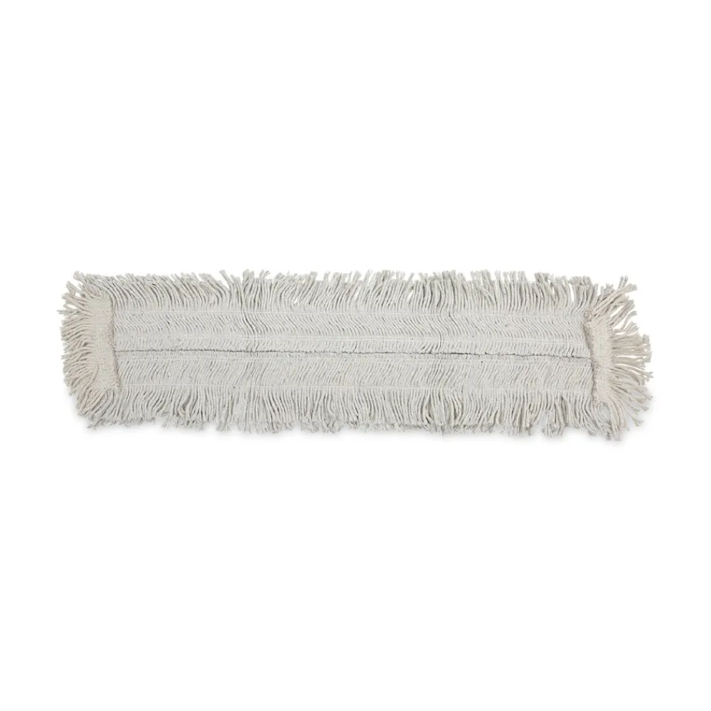 4-ply, pretreated yarn, dust mop head. Equipped with a slot pocket backing which allows a metal dust mop frame to slide into its place quickly and easily. Sewn center fringe for added coverage and durability. The disposable head can be discarded when dirty. Ideal for use on floors that require dusting, with or without cleaning spray. Handle and frame are sold separately.