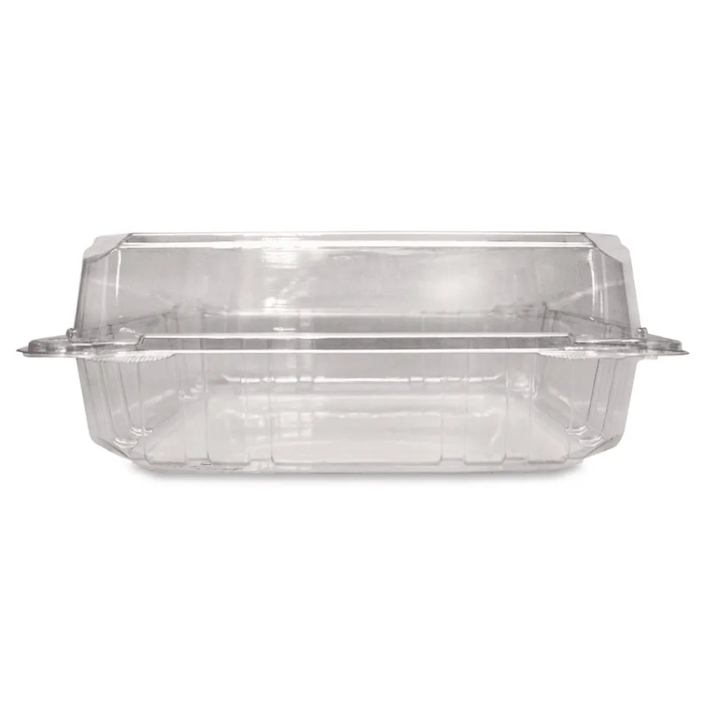 Karat PET hinged container line is made up of crystal-clear plastic that allows for easy visibility. The clear PET containers are heat-resistant, ranging from -10F to 120F, and are less prone to cracking. These containers are very sturdy and versatile, making them suitable for all types of food packaging.