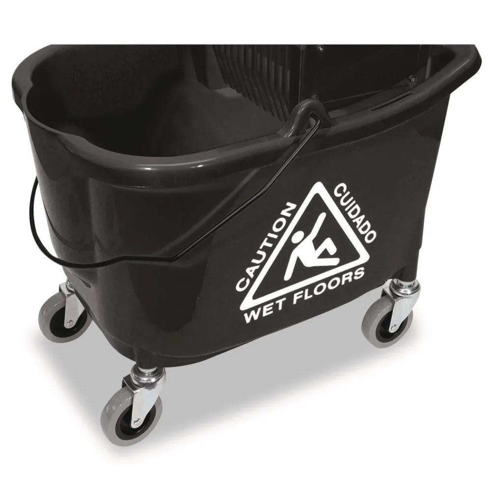 Premier Downpress Mop Bucket & Wringer has a 32 to 35 quart bucket and is made for use with up to 32 oz mops. The downpress wringer increases leverage and reduces fatigue.