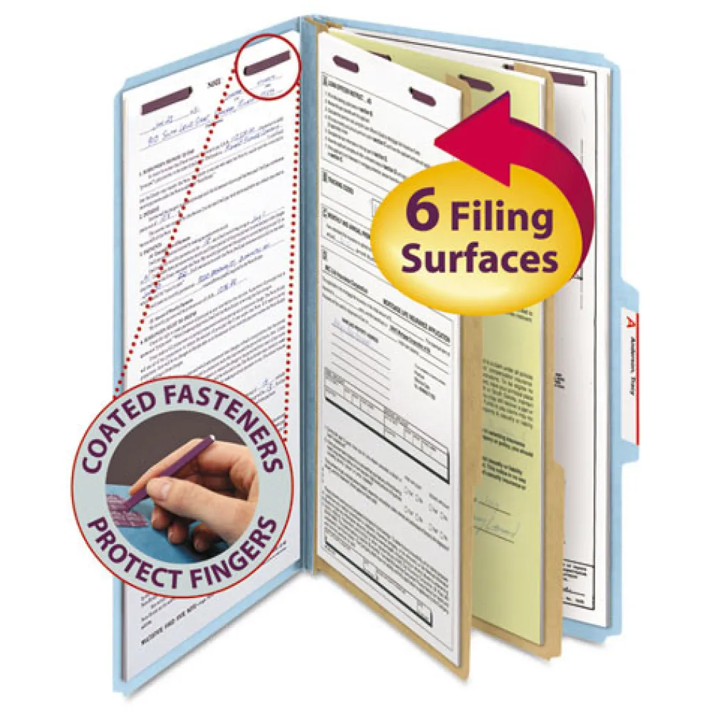 Smead 19030 Six SafeSHIELD Fasteners 2 Dividers Legal Size Six-Section Pressboard Top Tab Classification Folders – Blue (10/Box)