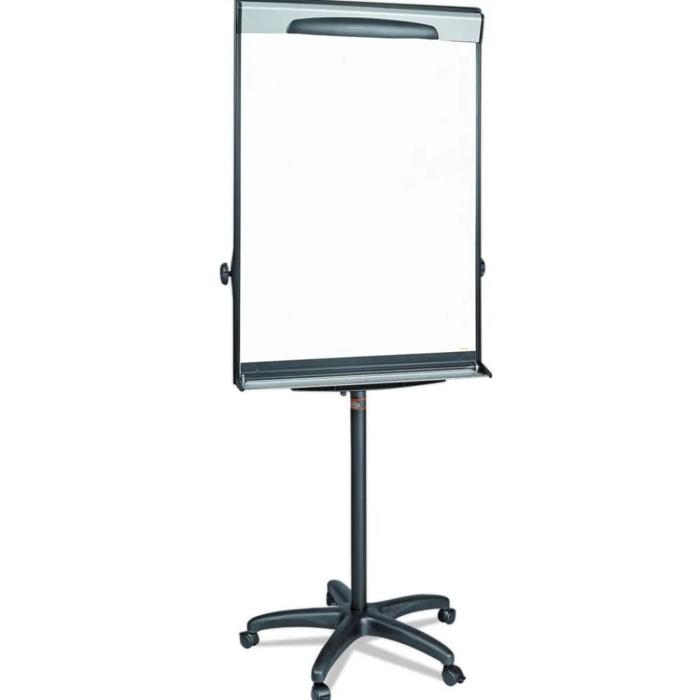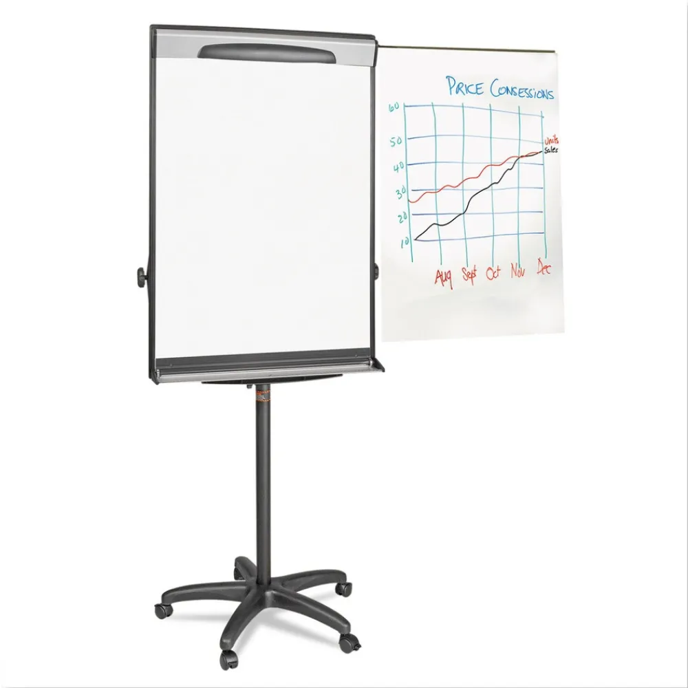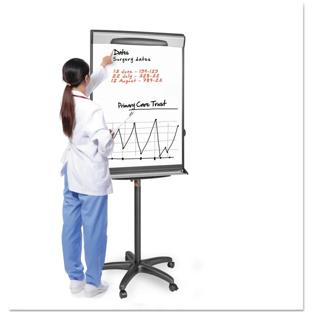 The Design Mobile Presentation Easel has a versatile base that delivers both great performance and mobility. The lacquered steel magnetic surface is ideal for frequent use, resists ghosting and staining. Equipped with a full length foldable marker tray that cleverly secures markers, the Design Presentation Easel holds any size of easel pad with its no-pinch pad retainer. Its steel base is both height and angle adjustable. It includes 2 magnetic extension bars that allow you to present up to three sheets of paper at one time.