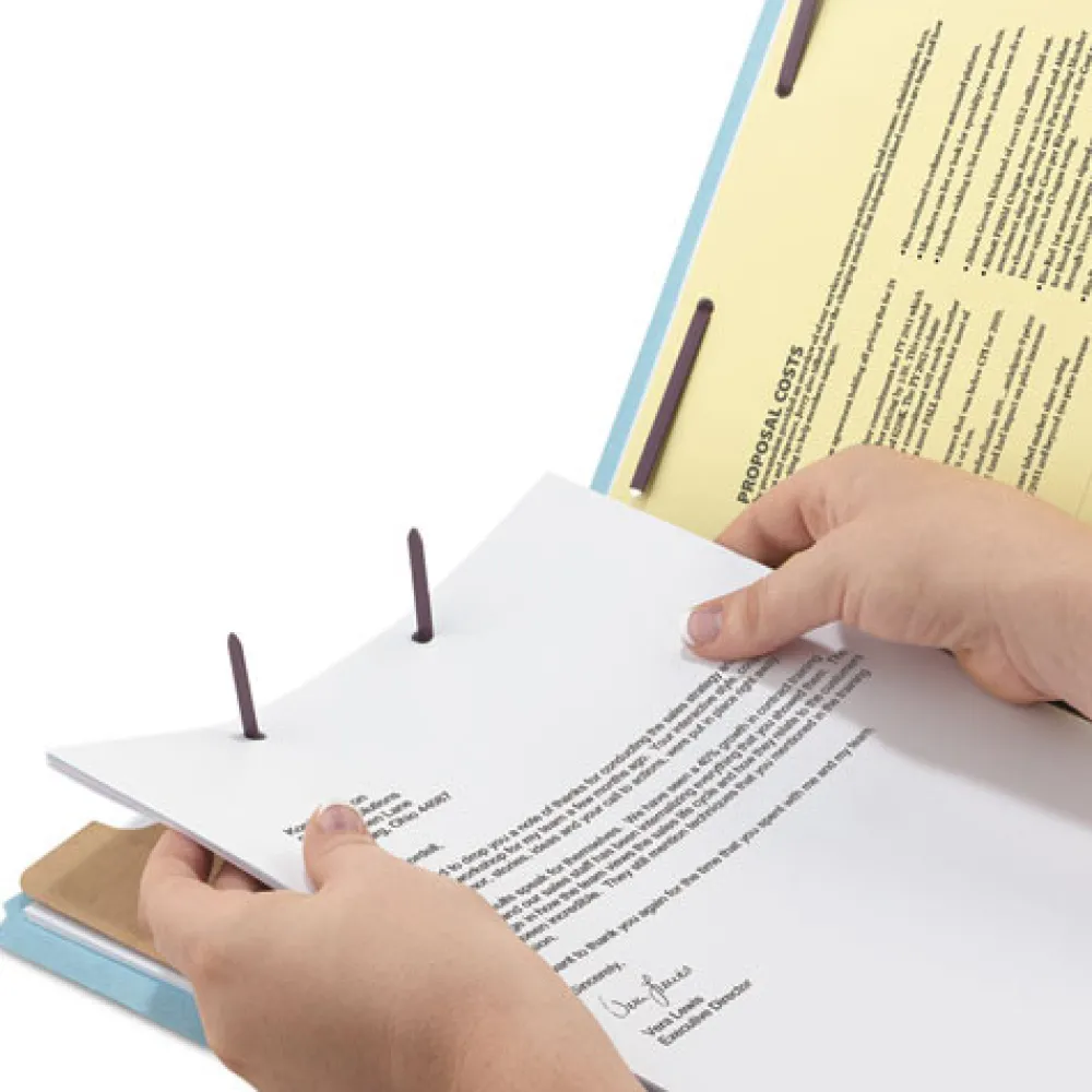 Partition folders with patented SafeSHIELD coated fasteners help prevent finger cuts, eliminate paper tears and reduce excessive fastener crinkling.