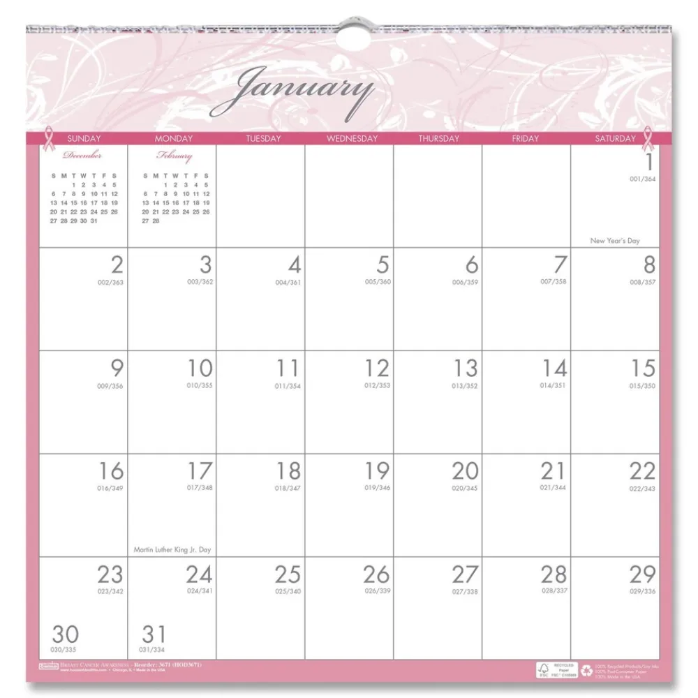 Heighten awareness of breast cancer, and show your support with this pink and gray wall calendar. Large unruled daily blocks. Strong wire-binding firmly keeps the pages together and in place. Includes a sturdy wire loop to easily hang the calendar on a wall. Made entirely of recycled materials.
