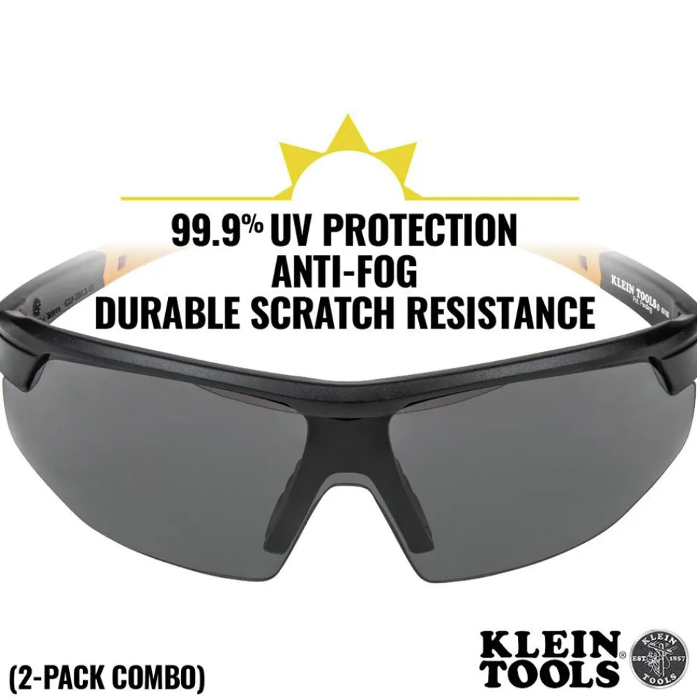 Klein Tools Safety Glasses are high-quality protective eyewear that feature an anti-fog coating that won’t wear off. Scratch resistant clear/gray lenses with UV protection block 99.9% of harmful UV rays. Lightweight and flexible materials for long-term comfort with rubber nose piece and temples for face conforming fit and sure grip. Combo Pack includes one pair gray lens, one pair clear lens and one soft fabric storage pouch. Optional Hard Case (Cat. No. 60176) and Breakaway Lanyard (Cat. No. 60177) sold separately.