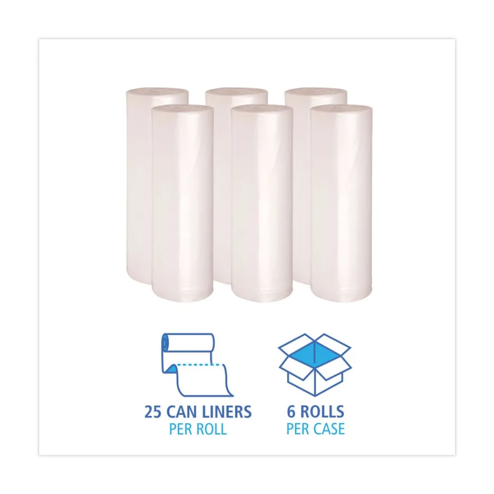High-density polyethylene liners provide superior performance at an affordable price. Made from 100% Prime resin for added strength and durability. The sturdy, star-seal bottom helps prevent leaks and provides even weight distribution for easy removal from receptacle. Coreless perforated rolls are easy to use and great for dispensing on the go. A quality can liner that provides trusted waste collection for light-duty applications.
