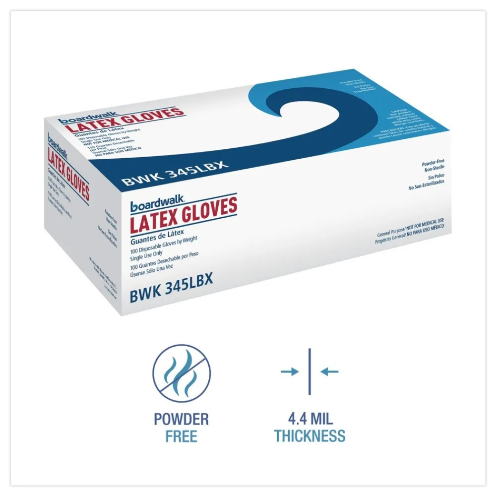 Boardwalk General-Purpose Latex Gloves are ideal gloves for food handling and preparation, general assembly, and manufacturing work. Can also be used to prevent the spread of germs and in other non-medical applications requiring dexterity. Ambidextrous. Non-sterile. Powder-free. Rolled cuff for easy-on, easy-off. The simple, self-dispensing box makes grabbing a fresh pair quick and easy. Single-use, disposable gloves.