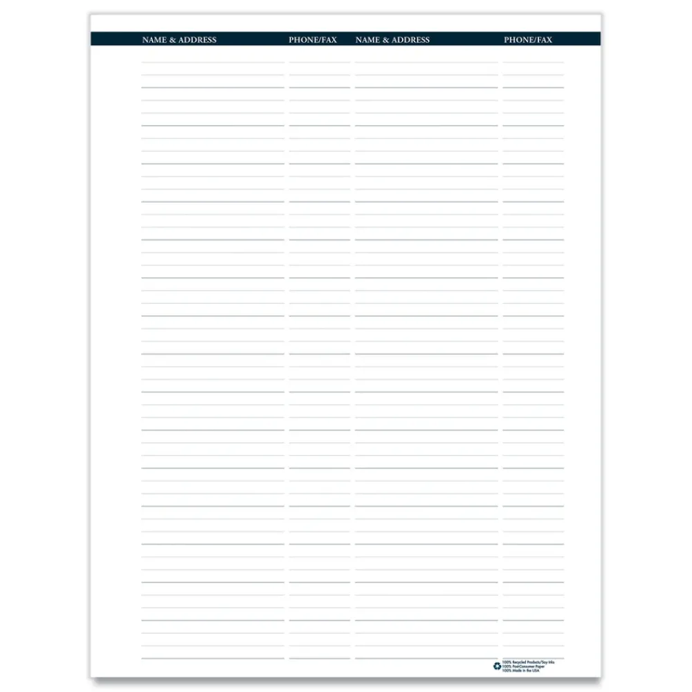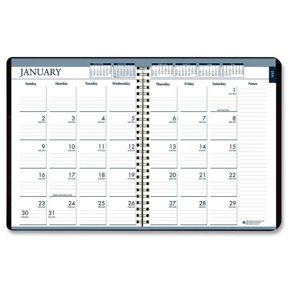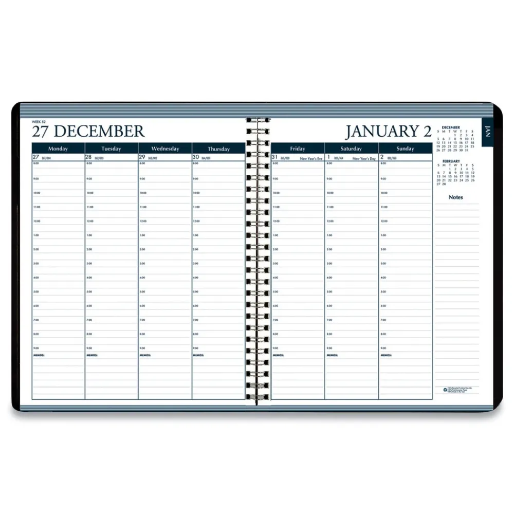 Each monthly two-page spread features a printed indicator for easy reference to allow you to see important dates and reminders quickly. The weekly pages feature one-week view per two-page spread with hourly appointments from 8:00 a.m. until 9:00 p.m., Monday to Sunday. A 2-sided pocket for storing important papers is included. The planner is spiral bound with recycled wire binding and features a sturdy one-piece black embossed leatherette cover to withstand the daily use throughout the year. Printed on recycled paper with soy inks.