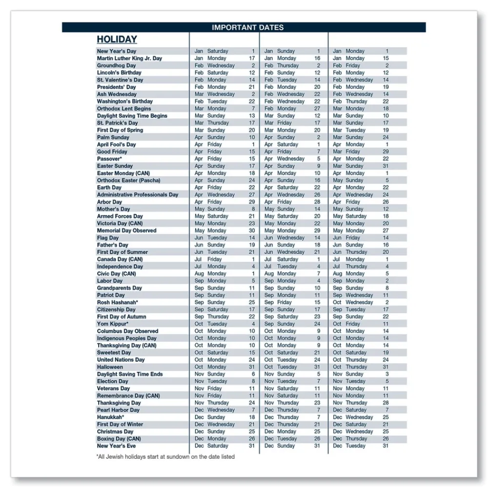 Additional page with important holiday dates for three years in list form