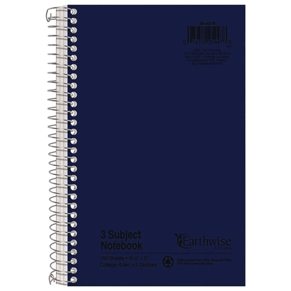 Earthwise by Oxford Recycled 3-Subject Notebooks have paper made from recycled fiber. These classic spiral notebooks have 2 dividers, durable covers and a sturdy no-snag coil that resists catching on backpacks, papers or clothing. Color may vary.