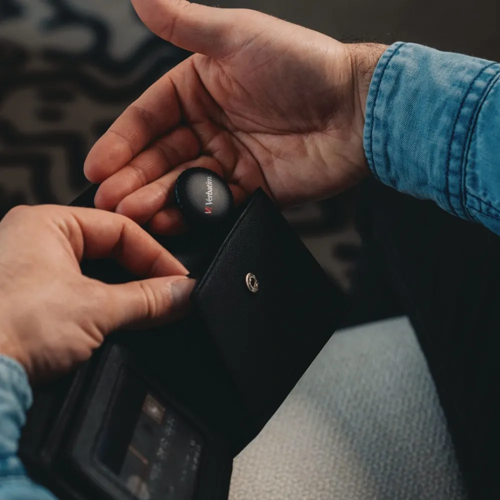 Our smaller tracking device works exclusively with Apple’s Find My App. Simply attach My Finder to the item you want to track and use the Apple Find My App to locate it. When you are in close range of the Apple Find My ecosystem, you can locate your lost item by selecting “Play Sound” in the app, allowing you to follow the beep to your item. You can also select your item in the app and locate it on the map an anonymous, encrypted process to protect your privacy. With the app’s Lost Mode, you can also enter your contact details in the event that your missing item is located by someone in the Apple Find My network. With smart notifications enabled on the device by default, you will receive an alert on your phone when your My Finder is out of Bluetooth range. Verbatim’s My Finder is water-resistant, dustproof, and has up to 12 months battery power.