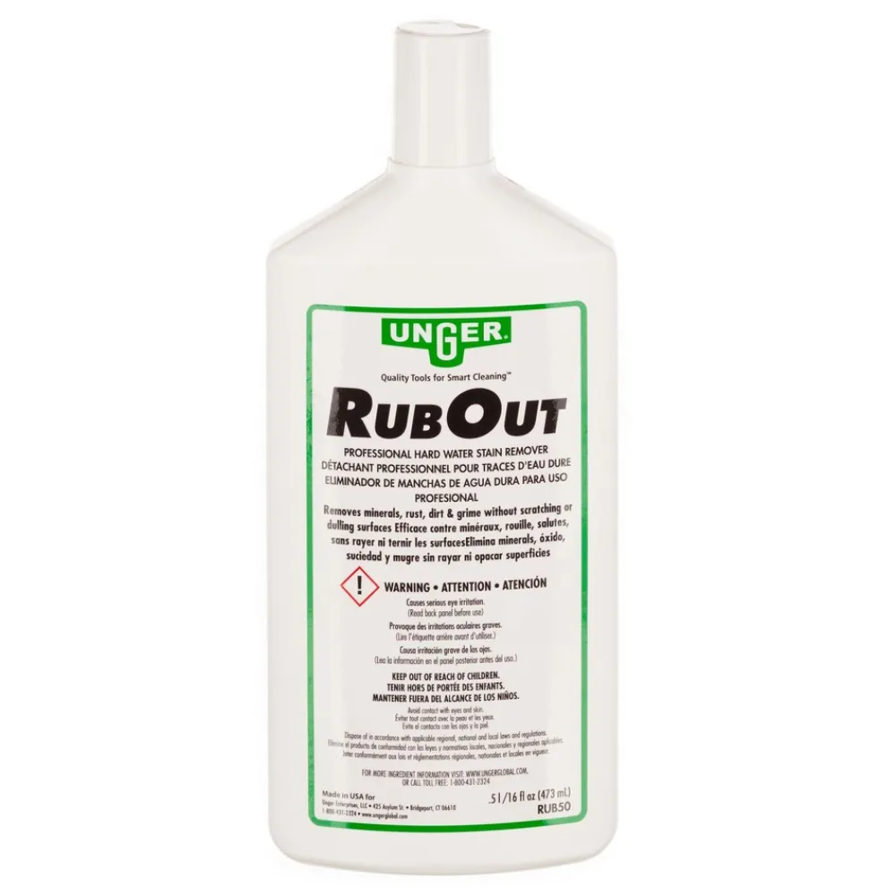 Keep your glass surfaces sparkling clean with the Unger RubOut Glass Cleaner. This heavy-duty glass cleaner removes hard water stains, rust, mineral deposits, lime scale, and soap scum with ease so you can maintain healthy and attractive glass at all times. Handy 16 oz bottle will fit perfectly in your janitorial bucket or cart. It’s perfect for restroom mirrors, windows, or any glass surface that needs some attention. This gentle formula will make surfaces look like new and keep your establishment looking its best.