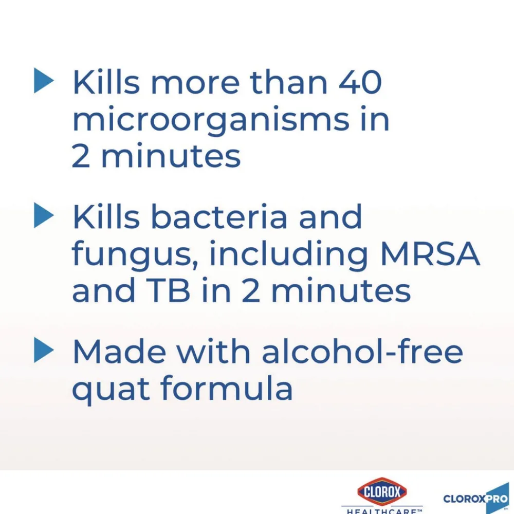 Clorox Healthcare VersaSure Cleaner Disinfectant Wipes kill over 40 pathogens quickly on a broad range of surfaces. These strong and durable clothlike wipes are your alcohol free solution to cleaning and disinfecting. VersaSure wipes are EPA registered to kill pathogens on hard surfaces in as fast as 30 seconds for most bacteria and viruses, including mumps, measles, MRSA and tuberculosis. These one step disinfecting wipes meet EPA efficacy testing requirements for hospital disinfection, making them great for daily use in your healthcare facility. Designed for patient and staff comfort, the alcohol free quat formula is made with no harsh chemical odors, fumes or added fragrances. The nonwoven wipe does not leave lint on surfaces, and the larger wipe covers more surface area with less effort. Intended for use in healthcare settings.